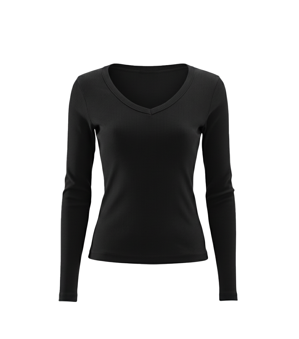 A softly structured long sleeve crafted from 100% ribbed cotton for a breathable, natural feel. Designed with a clean V-neckline that flatters the neckline and a fitted silhouette that hugs comfortably. Minimal, feminine, and effortlessly elevated.